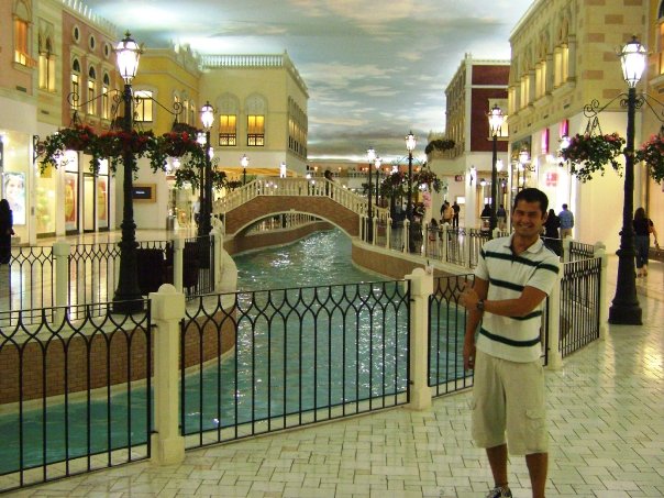We take three taxis to the Villagio Mall which, just like any other Middle Eastern extravagant desire, emulates the streets of Venice under a roof painted in sky motifs, even providing gondola rides in a makeshift pale blue canal.