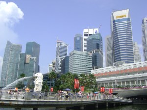 The sleepy boat ride along the Singapore River cruises in between banks of exaggeratedly tall buildings, which pile next to each other in a shoreline only interrupted by the sea, where a white lion that vomits litres and litres of water through its open mouth represents the identity of the country.