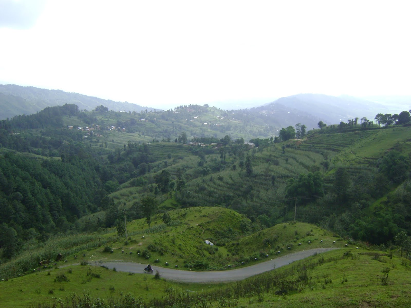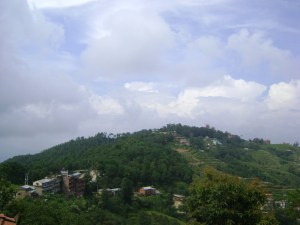 The road merges into a single-lane road and dives into lime-green pads of rice, at first flat, the pads rise up in several terraces of silver mud as we gain altitude. The van struggles and the engine screams under the scratched bonnet. The road dramatically climbs through a series of hairpin turns whilst the traffic around us swerves precariously clinging onto the patchy tarmac. Two hours later, the turns enter a village and the road sign reads Nagarkot.