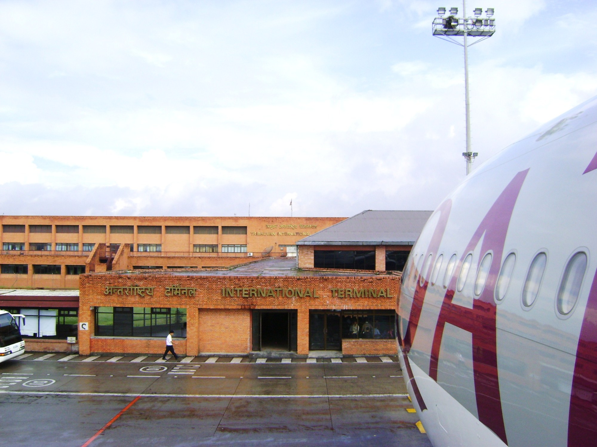 In the morning, a heavy Airbus sends shock waves of pure engine thrust as it climbs for its Bangkok flight, our flight being next to roar across the hollow valley. We sharply turn left and see the top of Mount Everest protruding from the clouds in the turbulent morning sky.  Foul-smelling mutton is served and passengers fall asleep before the midday arrival into Doha.