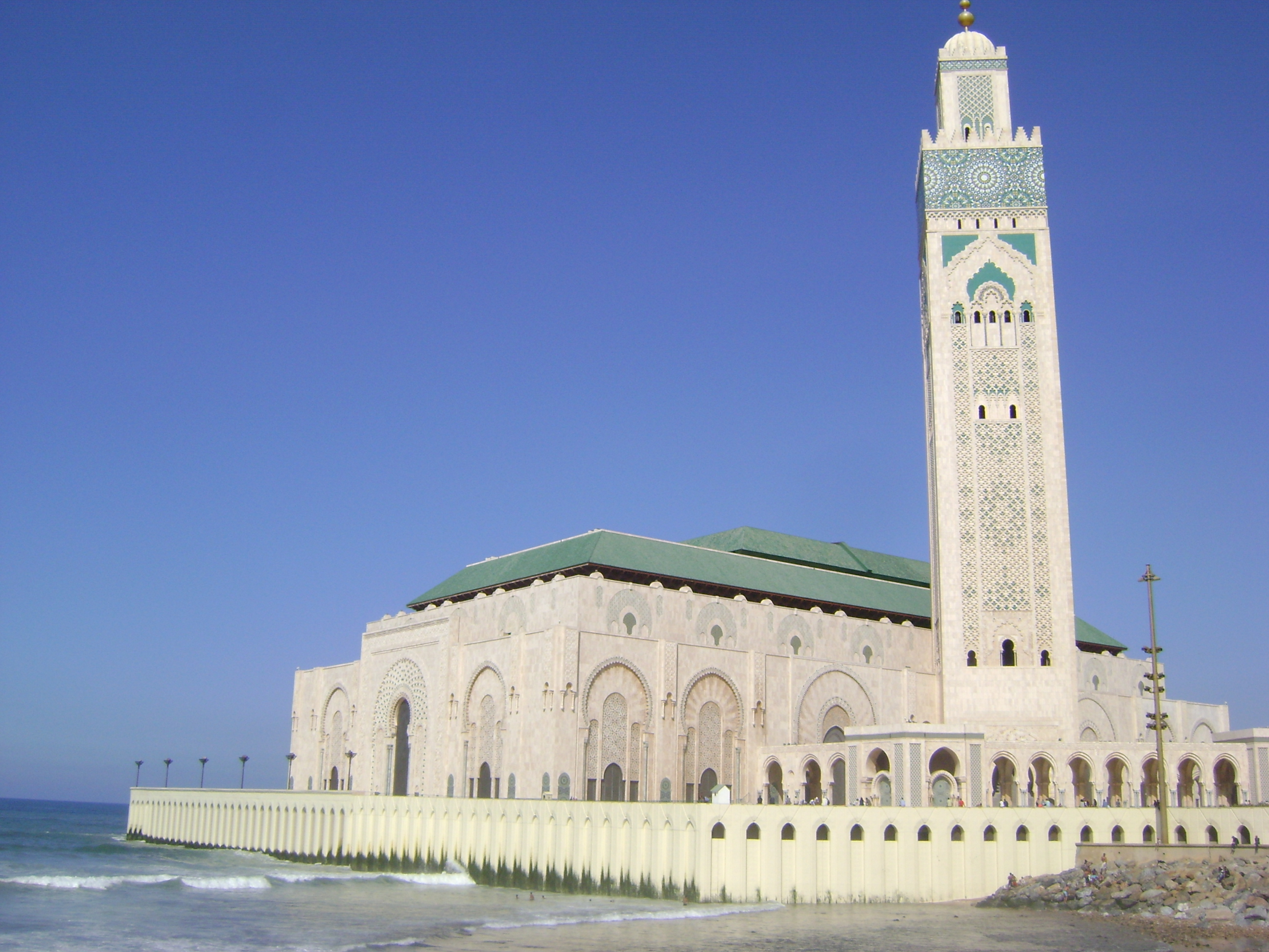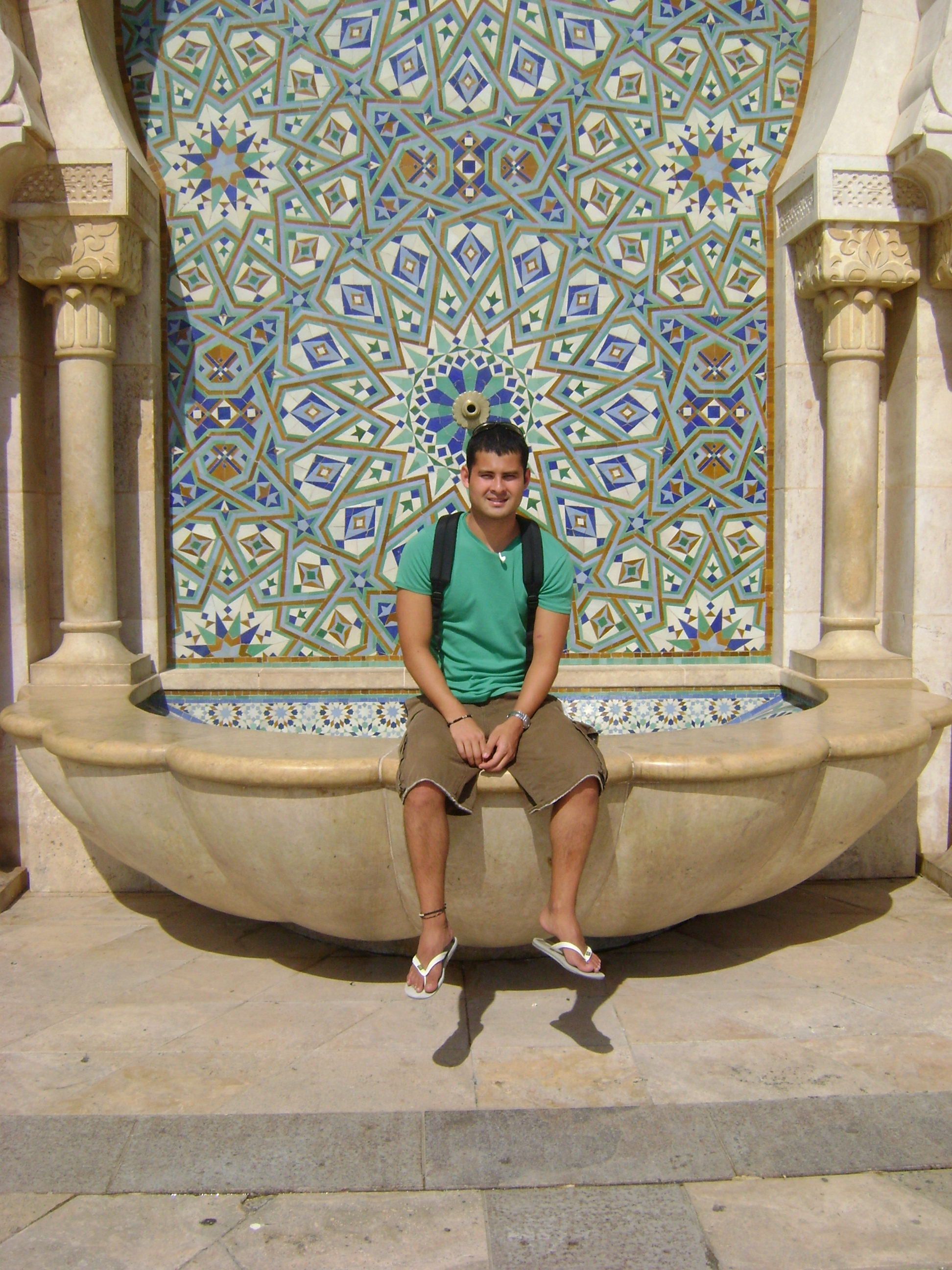 Tricked by my out-of-scale street map, I end a long walk at the Grand Mosque, where pilgrims are seen praying in clusters of gowns as white as the tiles that crown the beautiful arabesques. The light blue tiles of a water fountain represent the sky, the light blue of the crashing waves next to the mosque represents the wildness of the Atlantic Ocean, at this time the only standing barrier between myself and my family.