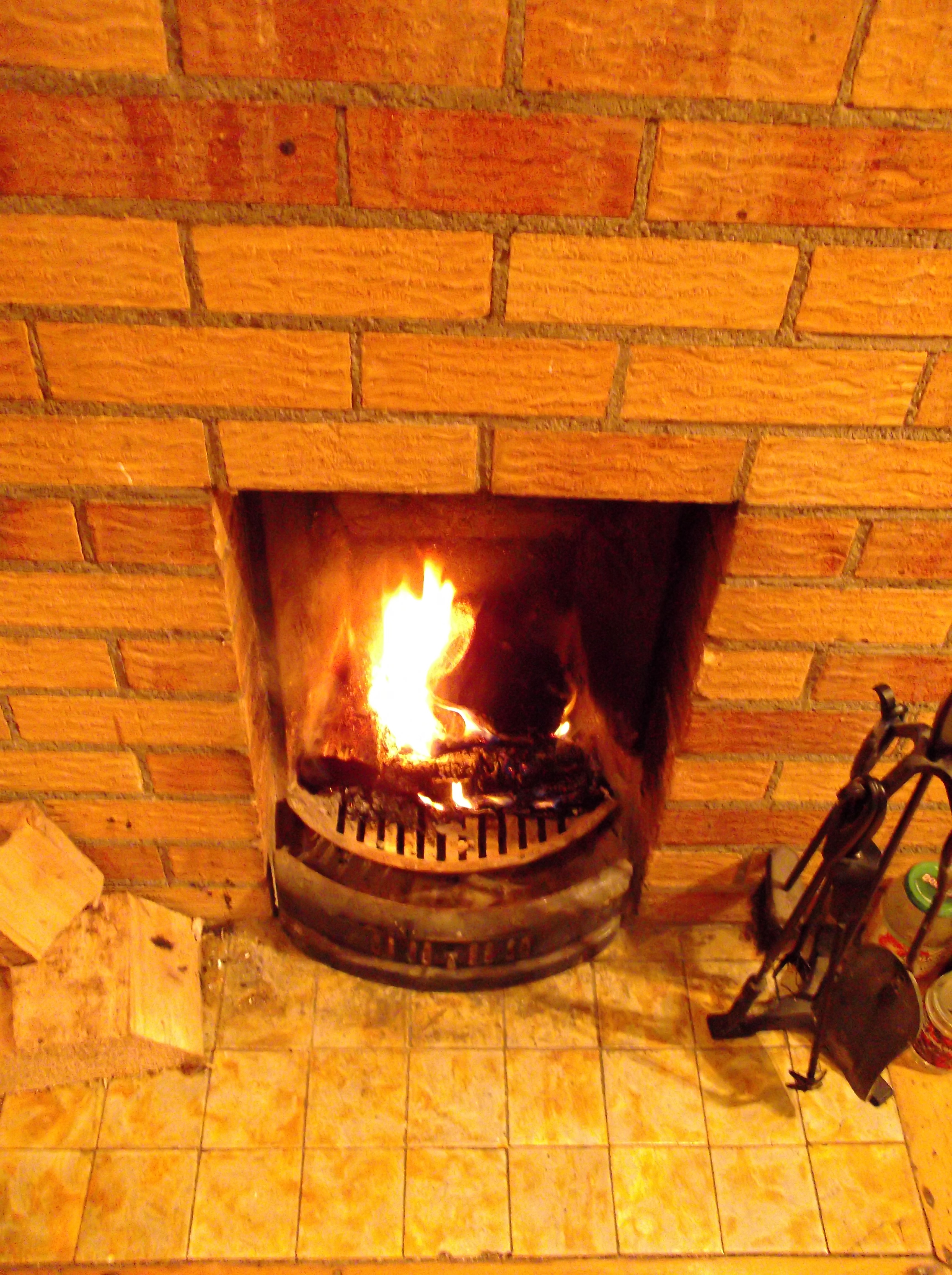 My friends and I have managed to secure a small turkey, which we place over the coffee table across the open fire.