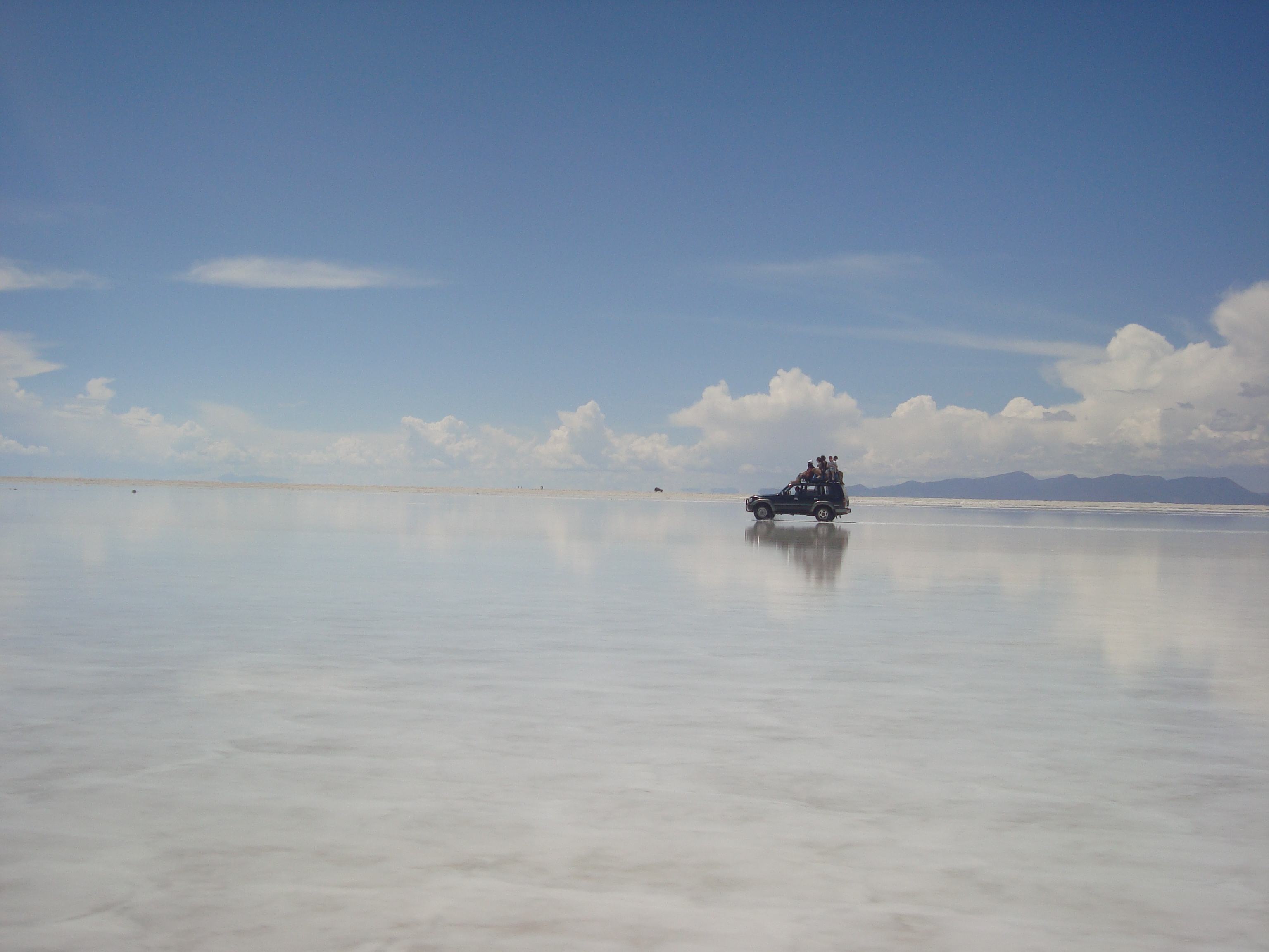We drive through muddy streets contouring the small town and without warning, the mirage becomes real. The largest salt flat in the world, ten thousand square kilometres of white bliss reflecting on the sky like a gigantic mirror encrusted in the desert. Within its area, the horizon finds no line and becomes endless, while the hotel made of salt near the rim is the only beacon between the life in town and death in the deser