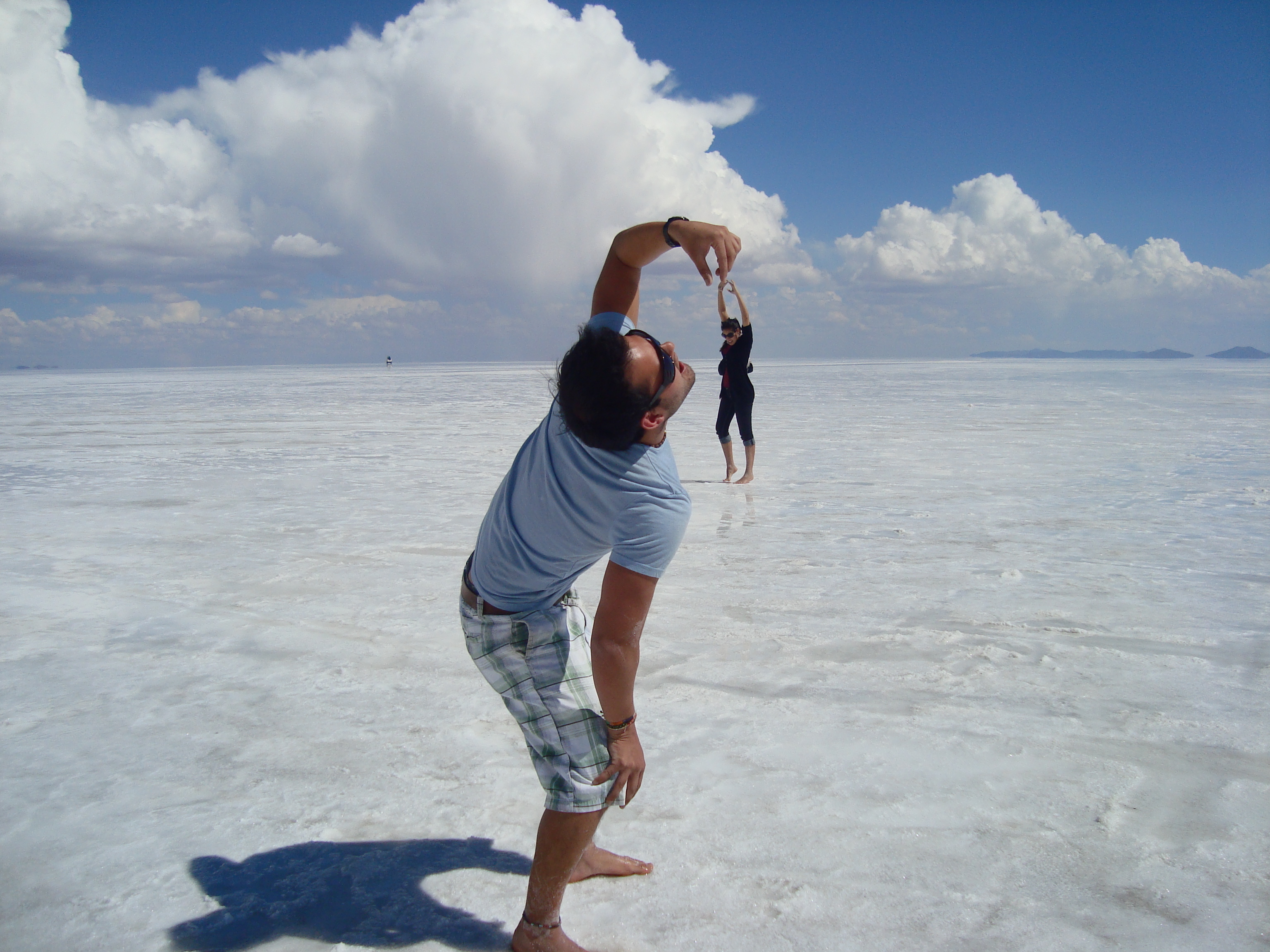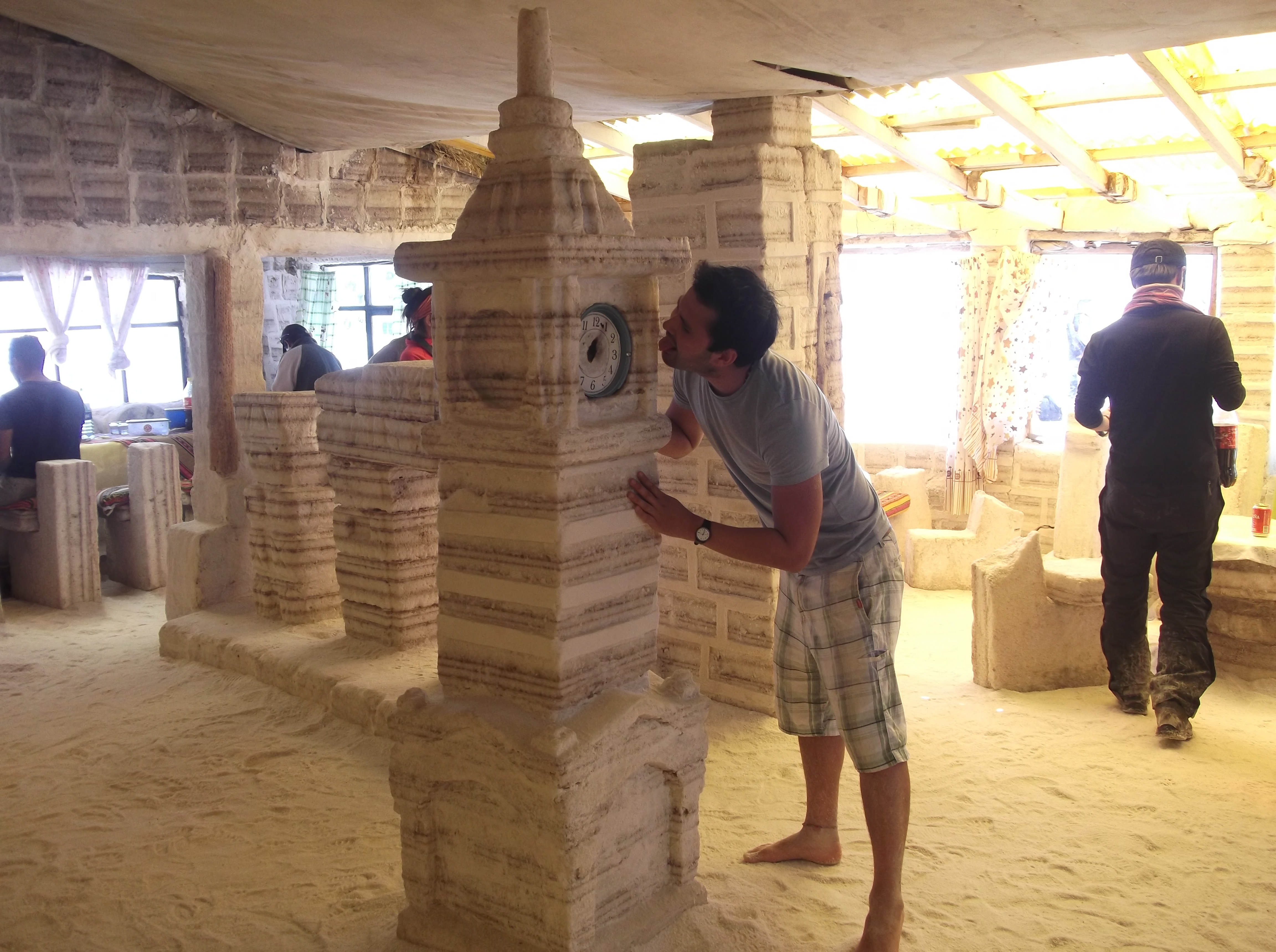 We step off the car and play in the salt. We play visual tricks with the camera, we lick the furniture at the hotel and we have an improvised lunch on a salt table.