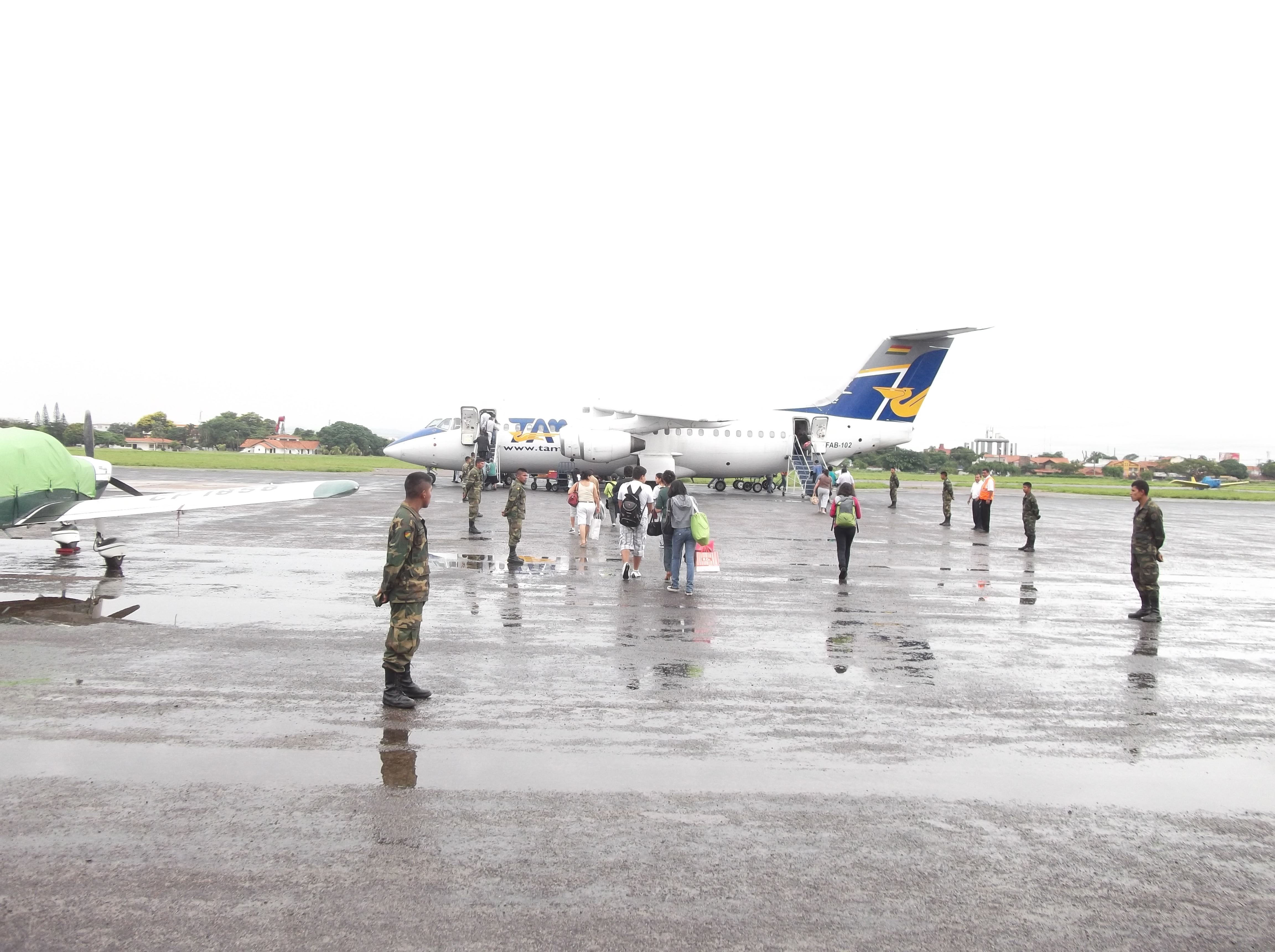 The El Trompillo Airport seems to have seen better days and a leak in the roof has been ducked taped and contained in a yellow bucket right in the middle of the hall. Two windows are covered in plywood and a light flicks and buzzes like a noisy cricket from inside the gate totem.