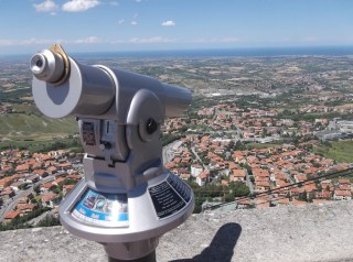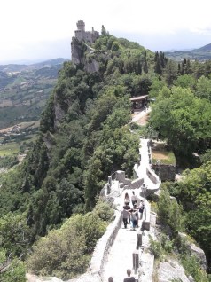 A gelatto refreshes our waiting in wealthy Rimini and soon, the low-floored bus takes my friends and I through a motorway which rises from the warm coast and soars through viaducts of spectacular height. As the altitude increases, a modest sign indicates the border between Italy and San Marino, the road turning onto his side revealing precipitous cliffs crowned by titanic stone walls.