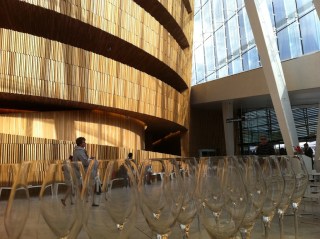 Inside the glass cube, yellow exposed wood curve upwards in an intricate staircase of white marble floors and peculiarly designed toilets.