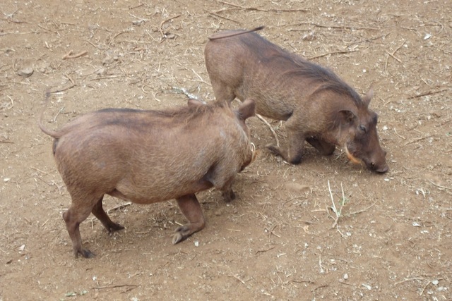 Giraffes seem to defy the laws of biology. Both clumsy-looking and elegant, up close, eyes are deep, round and starry . I am petrified few a few seconds, for a real giraffe is eating rations out of my hand. Her tongue is warm and long, wrapping around my palm with slime. As a camelid, they smell like horses and have almost the same habits. I caress her in between her eyes to appreciate her colourful and perfectly groomed skin, while underneath her long legs, a group of warthogs kneel on their front legs to eat leftovers.