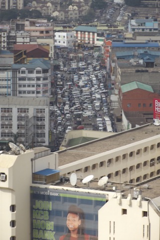 From the top of the Kenyatta Convention Centre, I shoot a few snaps of the nearly four million people metropolis. Skyscrapers of luxurious hotels and multinational offices flanked by narrow streets aggressively congested with markets and traffic jams.