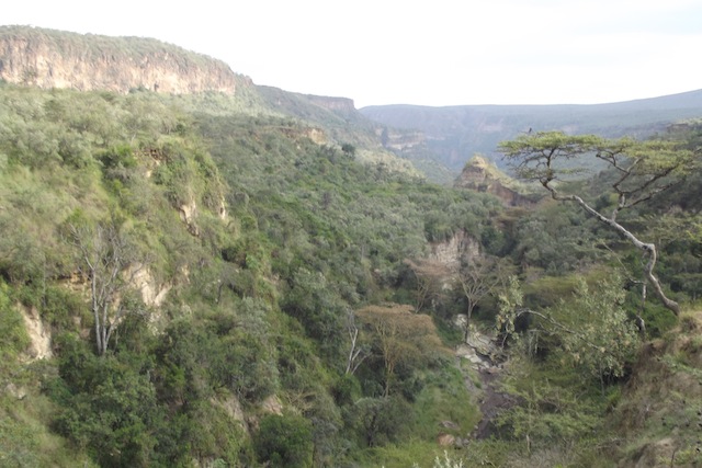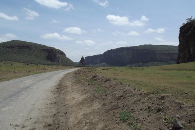 The sign reads ‘Hell’s Gate National Park’. A national park best explored by bicycle. Across the entrance, tall cliffs and soft hills are perfectly blended together and dip down a valley of collapsed horizons. Lonely trees scatter around the thick grass like solitary giraffes made out of wood.