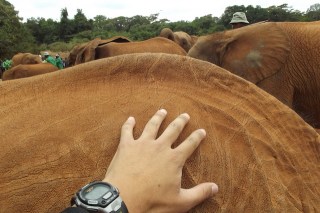 A rapid downpour falls and turn the air moist with sand and haze before a second heavier stampede hits the ground. This time adult elephants run across the field with the same energy as the little ones. I get to appreciate their true size up close and touch them as they have their bottles of formula and a few tree branches for lunch.