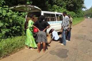 ‘It is morning time and already steamy hot. We hit a bump and a flat tyre. Our driver has a spare wheel but the jack does not work. I look around and see where Uganda blossoms: ‘He is doing the best he can’ passengers mouth, as they help the driver with the repair. A second minivan stops and lends us a new jack. The two minivans depart at the same time and the rest of the journey to Kampala is of laughs and food sharing. There are no grins, no disdain. Just a bunch of people helping one another.’