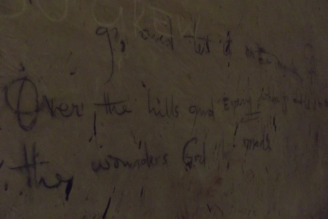 Roaches slither through the damp walls oblivious to the palms stamped with excrement and mud, oblivious to the cries for help written in black chalk moments before succumbing to death.