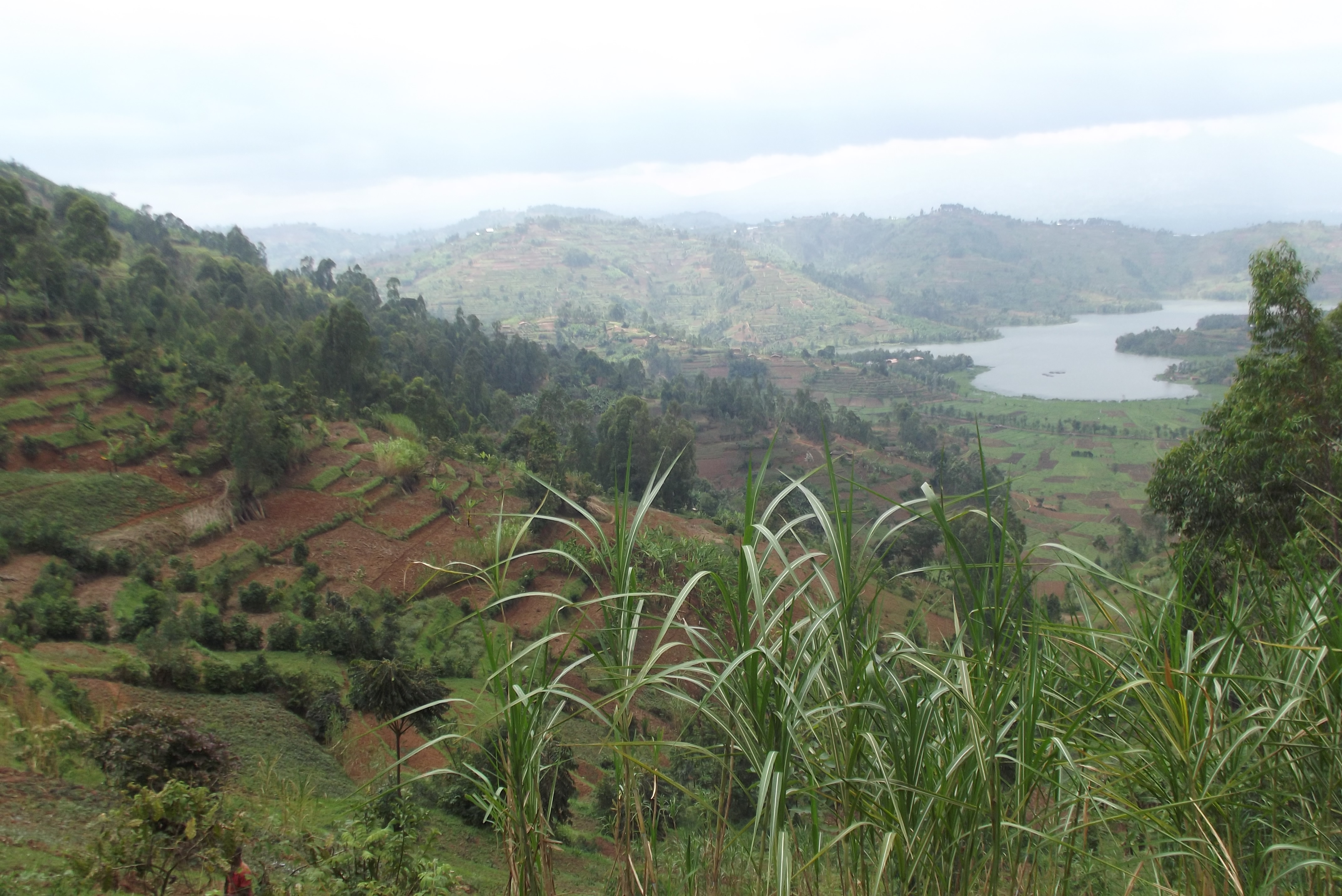 The road soon turns towards a valley and climbs in curves that shave hills like a sharp asphalt knife. The engine roars and the driver grows busy shifting gears. At nine hundred meters of altitude, the thousands of hills seem to emerge and disappear for as long as the eye can see. Flat land at last, for we have reached the top of a plateau extending towards the Virunga Range in a tapestry of green coffee crops. A four mile walk from Kisengi to Lake Ruhondo provides a tell to tale: