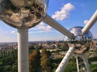 In the morning, I have troubles finding my way around the circular line of the Metro and victoriously, I reach the famous Atomium before anyone else. The morning sun reflects on the hundred-and-two meters tall structure in blinding beams of light. The building built for the World Expo in 1958 and shaped like a gigantic atom, is nothing short of an outdated relic of bygone atomic energy optimism, like a flight across a time machine of clumsy neon lights that seem to defy any sense of direction and induce the worst of claustrophobias. Endearingly tragic and amusing.
