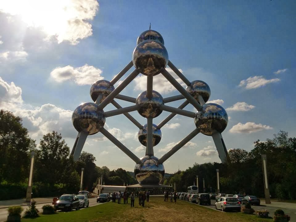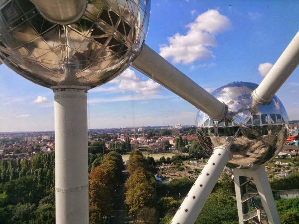 In the morning, I have troubles finding my way around the circular line of the Metro and victoriously, I reach the famous Atomium before anyone else. The morning sun reflects on the hundred-and-two meters tall structure in blinding beams of light. The building built for the World Expo in 1958 and shaped like a gigantic atom, is nothing short of an outdated relic of bygone atomic energy optimism, like a flight across a time machine of clumsy neon lights that seem to defy any sense of direction and induce the worst of claustrophobias. Endearingly tragic and amusing.