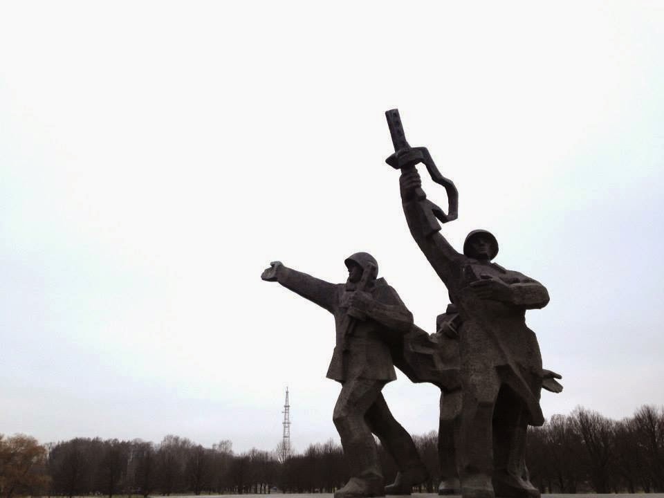 On the return leg and after a rapid Mc Donald’s lunch (romanticism momentarily over), I spot a train cemetery, the frozen lagoons of Arkadijas Park where two young dreamers are shooting a video and, almost by accident, I encounter the concrete-based Victory Memorial to Soviet Army.