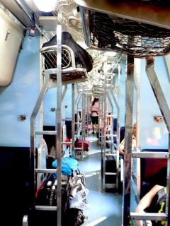 After two hours of waiting in the early morning stuffy heat and legs almost devoured by large mosquitoes, we are led to a bus that seems to have had better days for a short transfer to Surat Thani town.