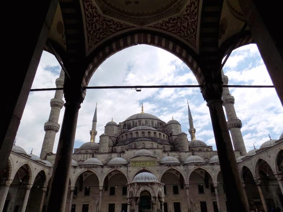 Grey clouds creep their way over the Marmara Sea and a downpour begins shortly after I clear the queue into the Blue Mosque.