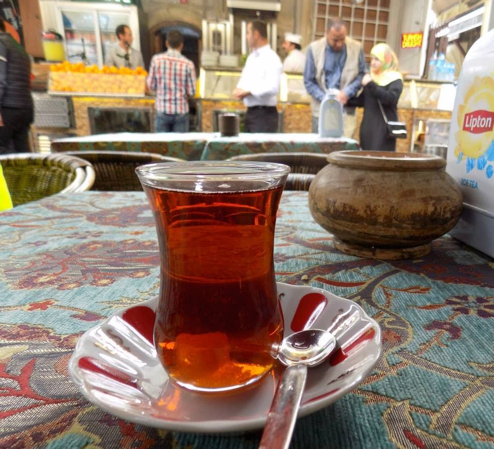 Despite the warm weather, the rain seems to heavily punish Istanbul, which makes for the perfect time for my first Turkish lunch, consisting in a succulent shredded chicken , served in flat bread with chargrilled vegetables and garlic sauce, smothered by a small glass of Turkish apple tea, whilst the sound of heavy raindrops muffle the loud chant of yet another praying time coming from the tall minarets.