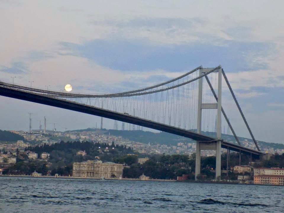 A point where the sight of the colossal Bosphorus Bridge spanning over the busy strait seems to merge with the sky, and a shiny full moon rising over Asia dyes the water of a pale yellow.