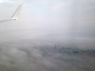Outside the plane windows, nothing but white can be seen, as we feel the plane banking left and right and left again before the vibration of the wheels being deployed for landing shakes the cabin.