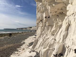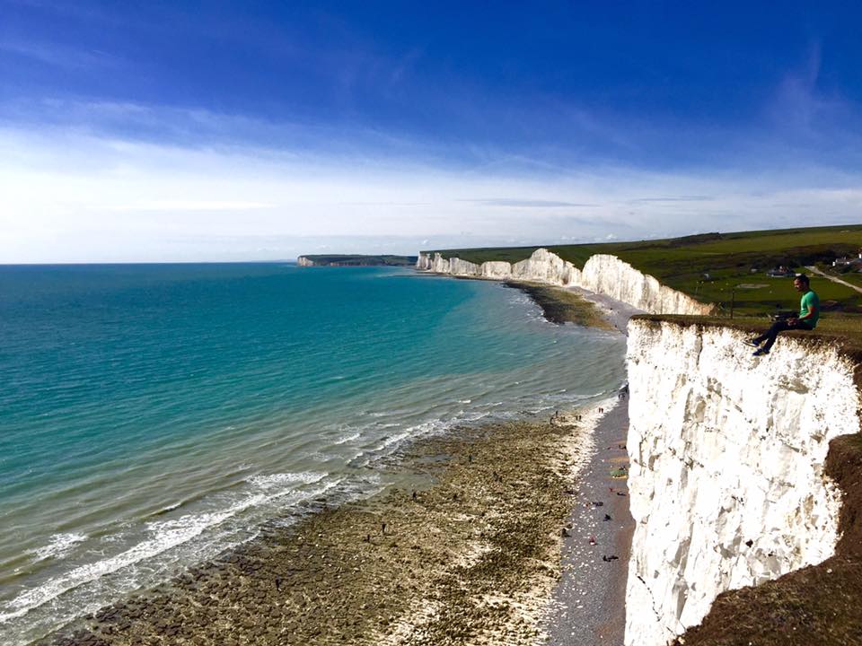 Hours later, myself, my friend and other tourists travel through the coast line of Southern England. The buzz of Brighton slowly surrendering to tall cliffs and suburbs lined with thatched cottages, built in burgundy coloured bricks, under the shelter of vivid recently-blossomed cherry trees, a journey ending in the vastness of the round green fields of the English countryside, stop for the Seven Sisters.