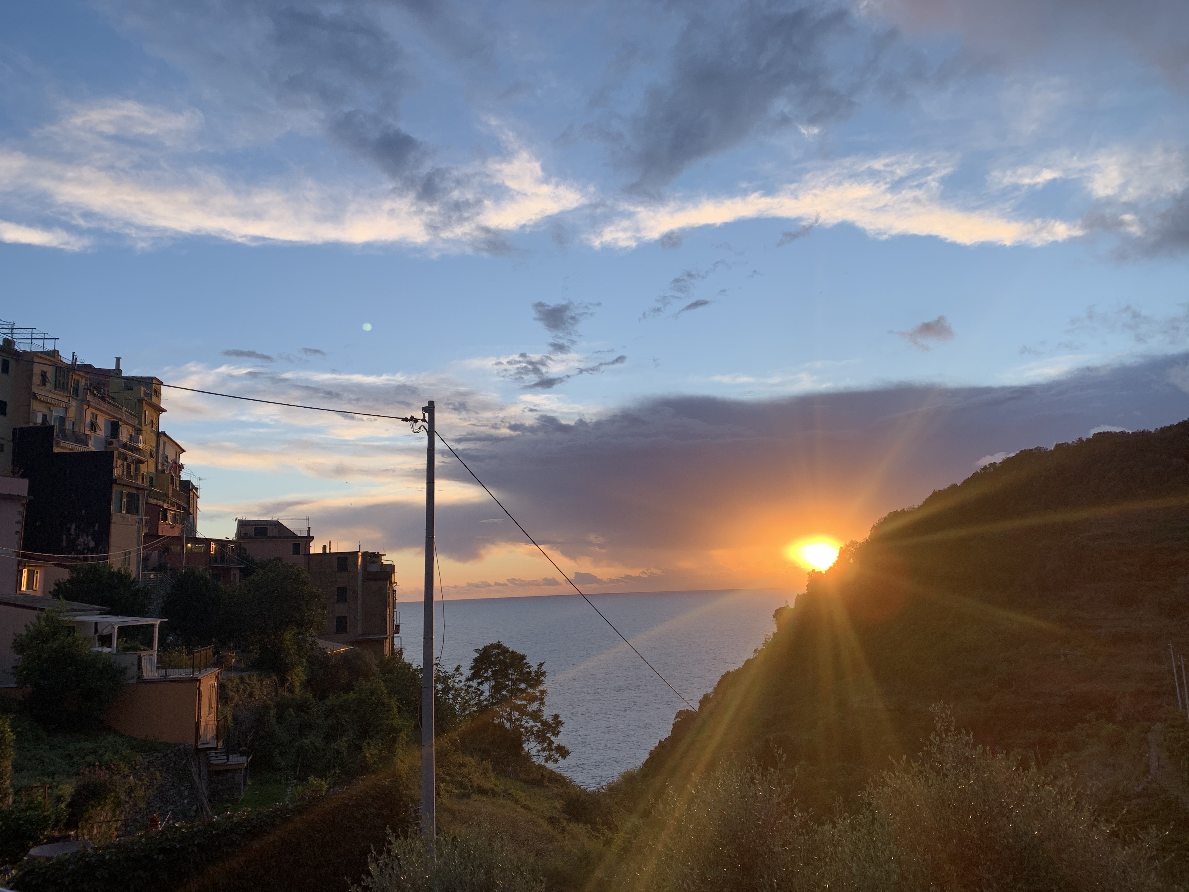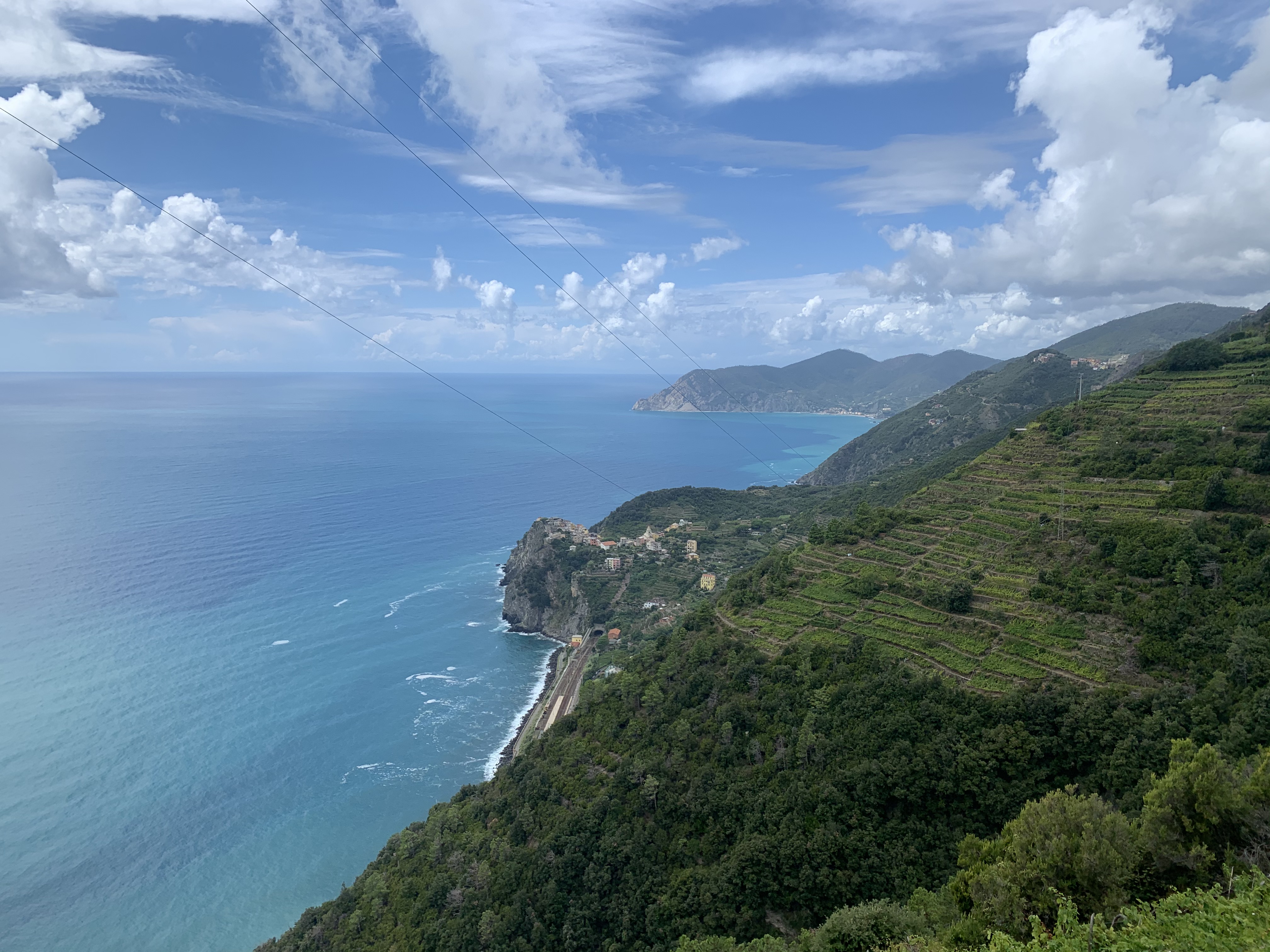 -Riomaggiore to Manarola: One hour. The Via dell’Amore is closed due to erosion. Terribly steep ascent to the top of the hill. My eyes burn with the sweat dripping across my face and my knees suffer with the descent into the fingerprint-like street layout of Manarola. I finish my second bottle of water and look across the hills now covered in low-hanging clouds before setting an even faster pace before the rain.