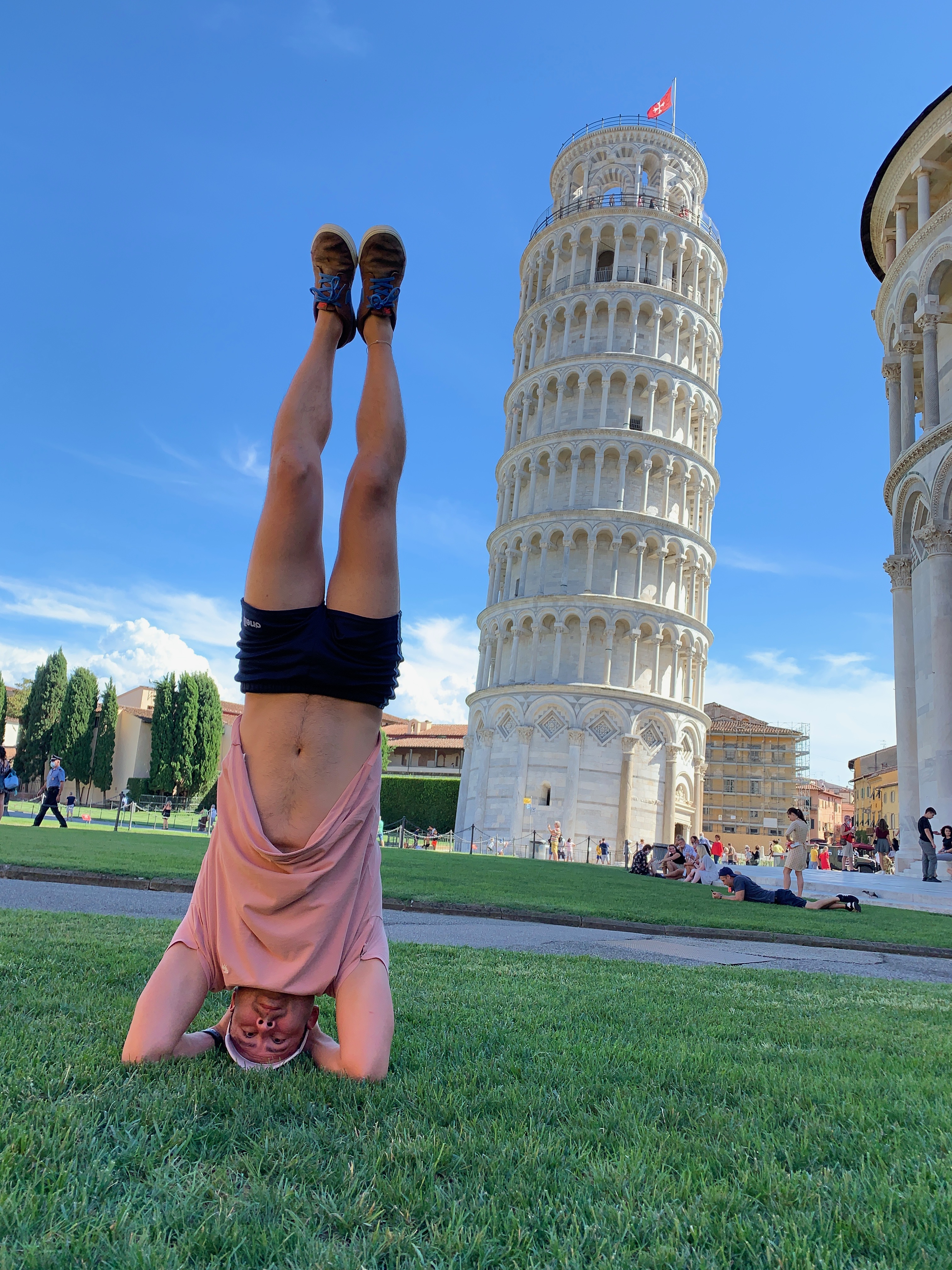 The last day in Italy is an overcast memory of some alone time in the beach, a short train ride to La Spezia for a change to Pisa and headstands by the leaning tower after a lunch of porchetta.