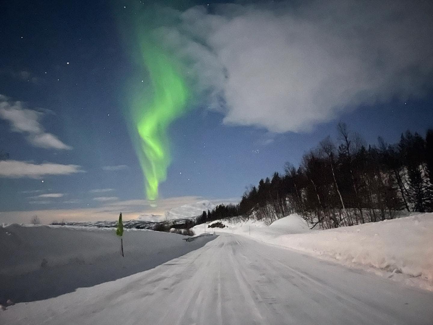 ‘Joined by a childhood friend, I hired a small bus, since these smaller tours can reach remote places more easily. Driving for two hours when it was still bright, the fjords were hauntingly beautiful. Forest reflected on calm waters like giants mirrors. We parked by a frozen lake and waited. First hour and I lost feel of my feet. Second hour and my mind wandered in despair. The sun set and I looked straight into the horizon and then I saw the first one. Faintly green dancing amongst the clouds, my first aurora borealis.